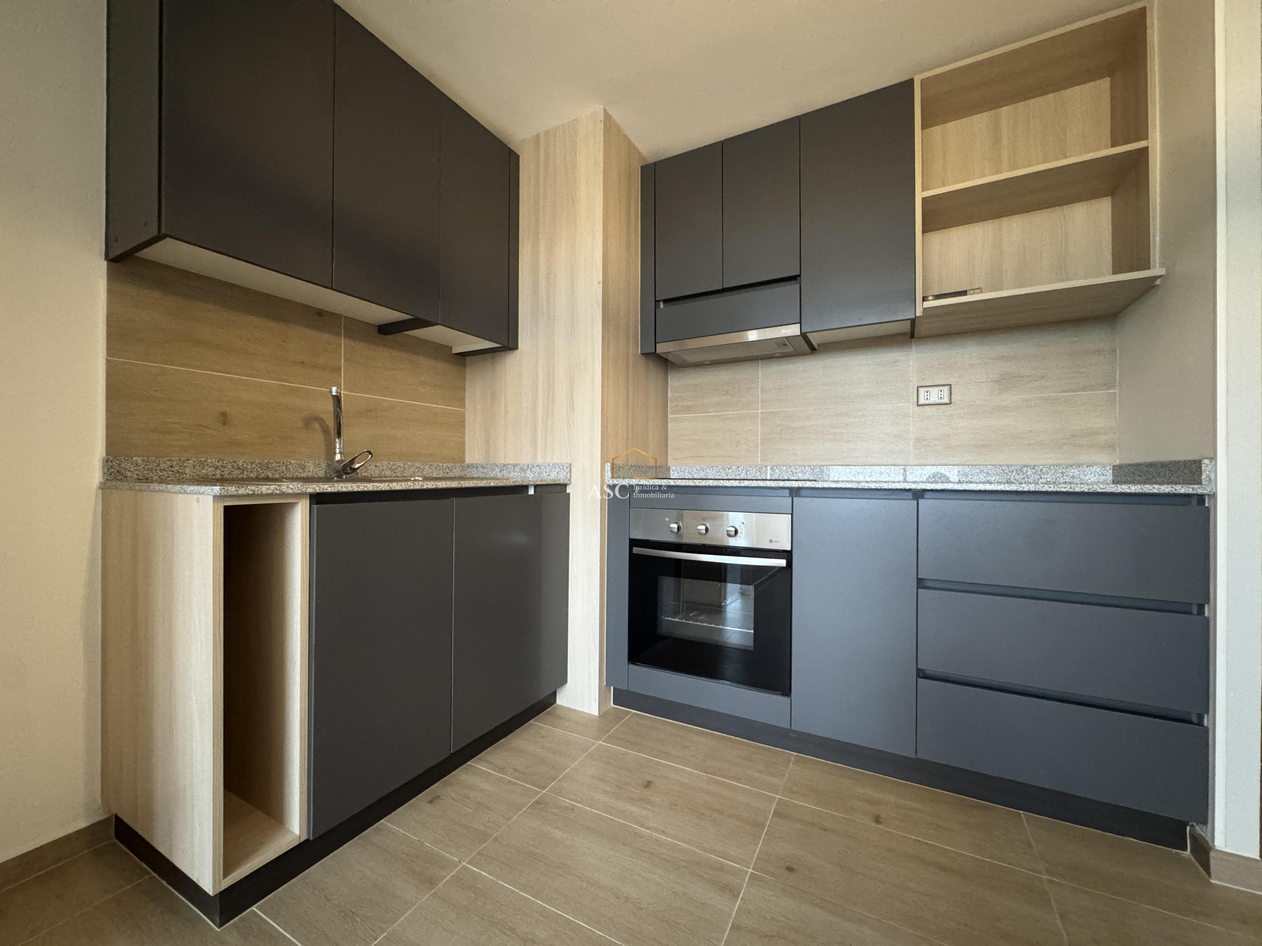Distribución: Living comedor, cocina amoblada y equipada con encimera eléctrica, horno empotrado y campana. 2 habitaciones (Dormitorio principal en suite, con closet). y dos baños.